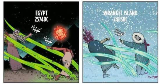 That temporal parameter dramatically changes in this volume. We witness, by panel, page after page after page of startling, repeated visions of death and decapitation by magical explosion. Each panel is dated, stretching back thousands upon thousands of years, in various cradles of civilisation- the African savannah, ancient Egypt, ancient Japan, ancient northern China, Mesopotamia, Mayan America, ancient Australia, and so on.