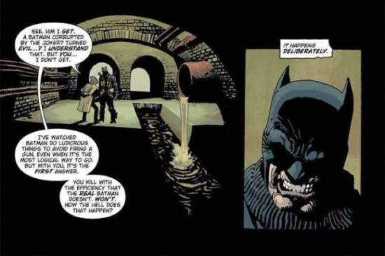 Readers should be rightfully dismissive of this misappropriation.Unlike the other parallel versions of Batman we have encountered so far, this one was not the outcome of some sort of integration with another DC Comics property. The Grim Knight instead simply chose guns over lives.