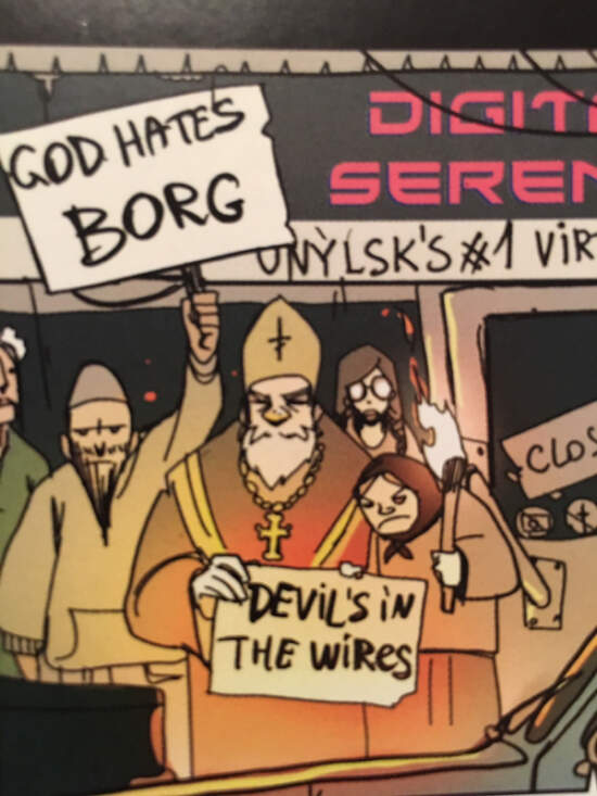 Russia and its neighbours are, as a generalisation, religiously conservative countries, and Ms Safro picks up on what would be an inevitable distrust of cyborg enhancement. Being a hooked-in cyborg is not just illegal, but is also a basis for xenophobia. At one stage during a delivery, Danilych is chased down the street by a rural lynch mob. The angry country folk have by accident seen his modified skull.