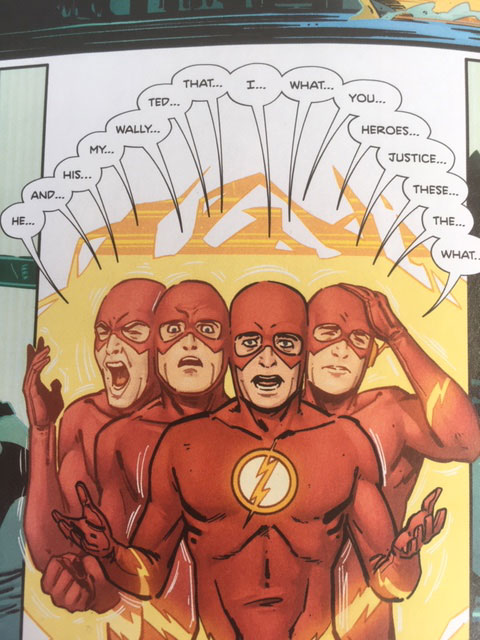 But with this latest issue, American writer Tom King is now steering very close to the editorial mandate given to him by publisher DC Comics. Somehow, Mr King has to integrate into what started out as a respectably serious story about post-traumatic stress disorder suffered by superheroes some editing of DC Comics’ continuity. The issue seems to be to do with The Flash. The Flash is a superhero who can run very, very fast – in some iterations, faster than time. There are usually a few Flashes about. This time, we have two Flashes in play – the Silver Age version, a police scientist named Barry Allen, and his successor, Wally West. West’s adventures before the most recent reboot of DC Comics’ continuity involved a wife named Linda. West talks about it during a therapy session, depicted in this issue: