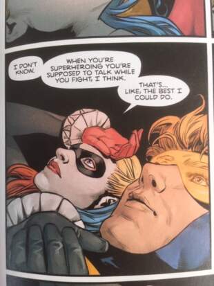 The churlishness extends into Mr King usual polished banter: here, Bat-villain Harley Quinn explains why she was singing in nursery rhymes when she fought washed-up superhero Booster Gold –