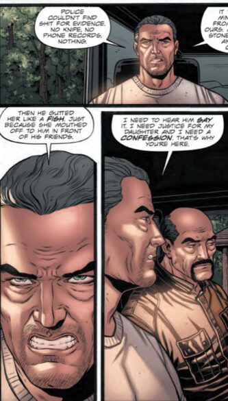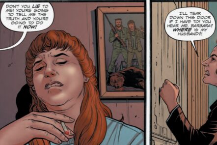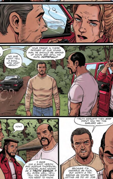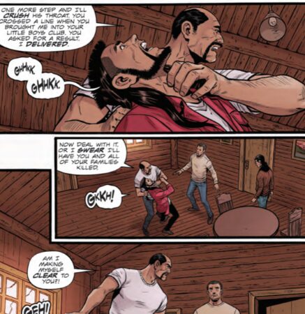 The kidnappers eventually realise that the teenager is not going to be as easy to crack as they assumed – Brian, in particular, is desperate but driven, and the tension between wanting truth and engaging in a kidnapping start to show in his voice. Ross calls in a favour from a shady friend who puts them in touch with a “specialist”. We initially see the specialist only from behind in the first issue. The man is a thug, looming over his intimated teenaged son, a pregnant wife, and a young baby. A piece of leather – a belt? – is wrapped around his fist. It is a deeply unsettling scene.