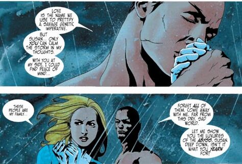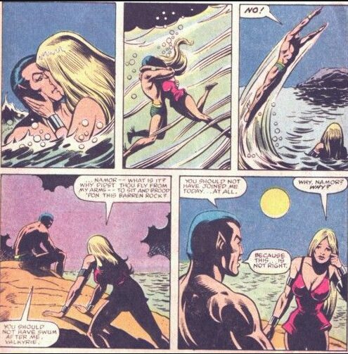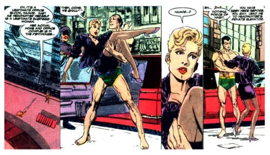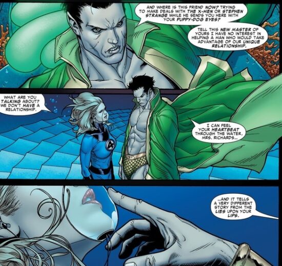 The Sub-Mariner has always had a thing for Sue Storm, later Sue Richards, a character known as the Invisible Woman and a member of the superhero team called the Fantastic Four. Being shirtless has had an effect on the Invisible Woman, and Namor has never been above efforts to undermine her marriage: