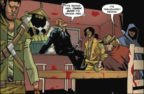 At a bar called “The Call Up” (appropriately so for a location which causes the main characters to come together), an assassin closes in on his target, only to find that he is the target of a second assassin. The second assassin is the target of a third assassin. And so on, until the loop is completed on six dangerous men. All of these fighters, armed with various types of swords, learn that they have been collectively set up for death at each other’s hands.