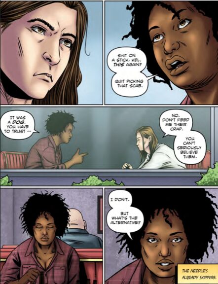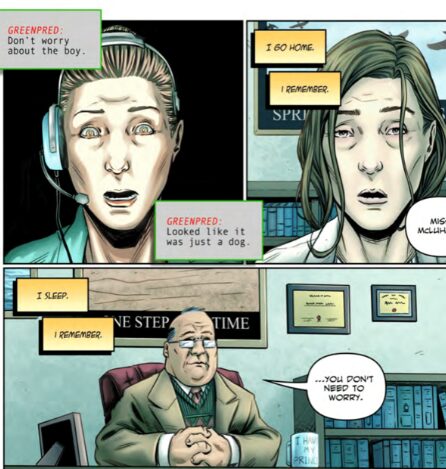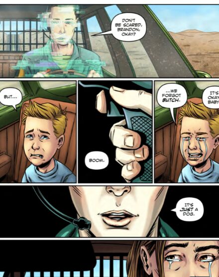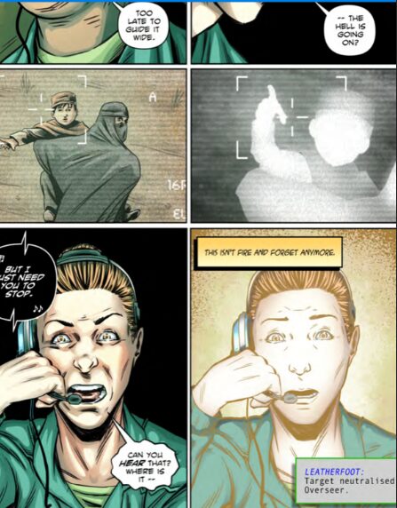 This facade comes tumbling down when Kelly realises she has accidentally launched a Hellfire missile strike on a mother carrying a boy. The Predator gives an infrared vantage. The boy, alive and radiating body heat, sees the missile approaching and points to the sky. And then he is gone in a white flash. It is an horrific and haunting scene, immaculately rendered by artist Gav Heryng.