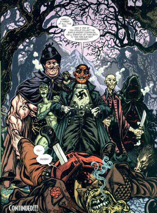 3. the characters are at war. They have no serious qualms about killing and inflicting serious harm. The Bat reminisces to himself about the time he choked to death a Nazi spy, the man pleading for his life. When interrogating an albino cut-throat called Jack the Grin (the story’s reinterpretation of the Joker), the Bat has no hesitation about injecting a painful truth serum into the base of Jack’s skull with a large syringe. Jack disappears from the story after that. We doubt Jack is sent to Arkham Asylum as the Joker is after being captured yet again by the Batman in regular adventures: we suspect Jack ended up dead and thrown into the streets for the dogs. Later, fighting a Nazi zombie version of Batman’s nemesis the Scarecrow, the protagonists try their level best to kill him, eventually succeeding. In the second story, Batman uses a kukri knife to slice off the hand of Two-Face (not the classic scarred version, but a version which is half-insect).