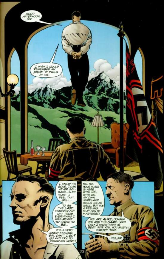 Some of them are more obvious than others. The main protagonists in the first story are the Bat, the Clock, and the Owl, together known as the Unholy Three. These are wartime secret service operatives who in the first story fight Nazis, mostly in North Africa. There is a strong sense of the classic motion picture Casablanca in the setting and with some of the characters (notably with the singer and informant, the Canary), accentuated by artist Tony Harris’ beautiful period artwork. But the Bat is plainly Batman, the Clock is Hourman, and the Owl is Doctor Midnight. Batman is a globally renown franchise, but Hourman and Doctor Midnight are only nowadays recognised by devoted readers of DC Comics.