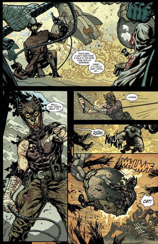 But what this does is remove the story from the original concept of taking known superhero characters, mostly from the 1940s, and stripping them back to what they would have been like as soldiers in a war. The crunch of the ill-fitting pieces is explained by Comic Book Resources https://www.cbr.com/jsa-whistling-skull/ – The Whistling Skull was originally intended to be a creator owned series published by Wildstorm Comics. When Wildstorm was absorbed by DC Comics, the story was repurposed to become a Liberty Files prequel. We do see the Clock and the Owl as bookends to the story, and we see the death of the Cat (disappointing rendered as a male version of Halle Berry’s interpretation of Catwoman, complete with whip, rather than as the heavyweight boxer which is Wildcat).