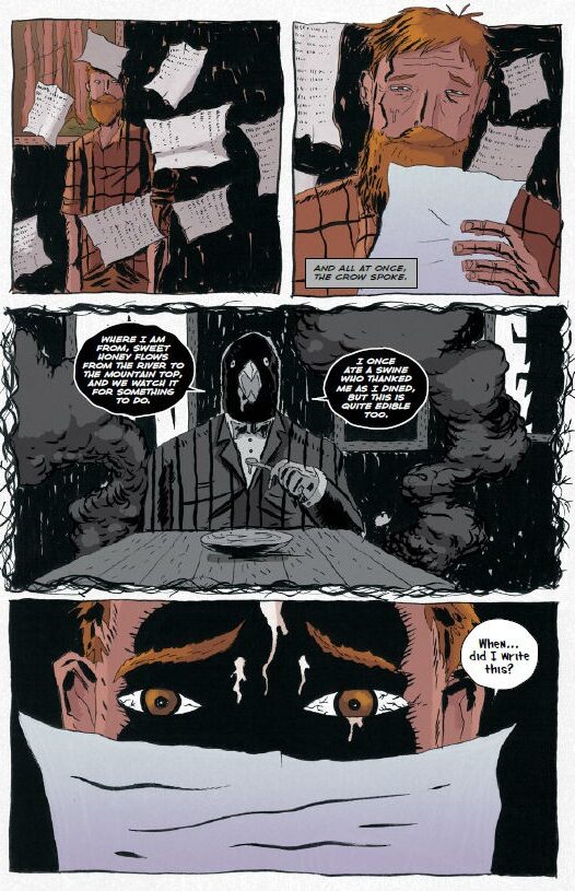The conclusion sees the two reduced to feed for the voracious raven. Peas in a bowl, silently screaming: a simple but remarkably chilling image. The panel is reminiscent of the story arc Mansions of Silence in Mike Carey’s Lucifer (2004, Vertigo Comics) , where the souls of two characters, Elaine and Mona, are sewn together by a dead Japanese god into a chain of lanterns, screaming silently and helplessly. Hans and Retha are the “sweets” of the title.