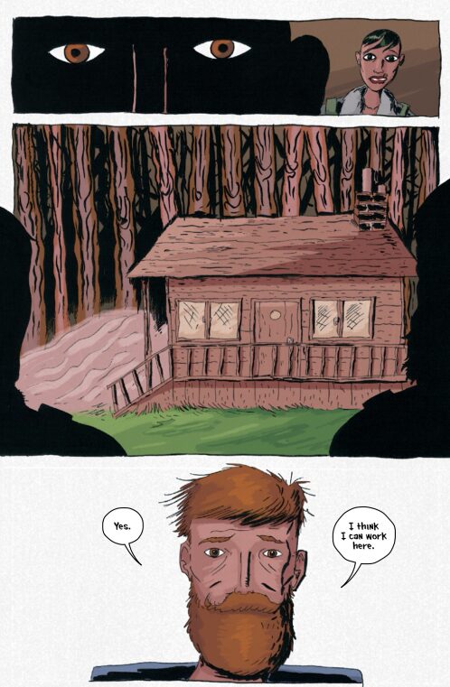 But the other pervasive but not as obvious symbolic aspect of the story is the use of clinging vegetation: roots and branches, drawn with finesse by Mr Laurie, which bind and trap, living but rotting in forest mulch. Hans in his descent is a “wooden man [which] paints a new face“, a marionette with strings tangled. Even the house is made of wood.