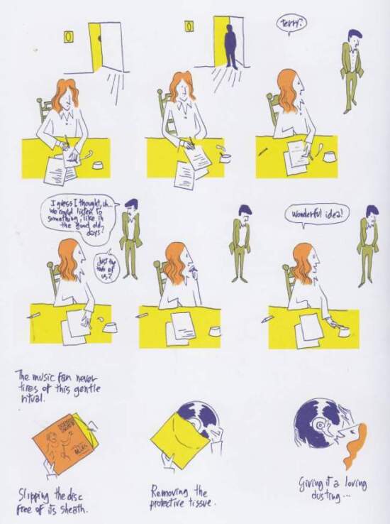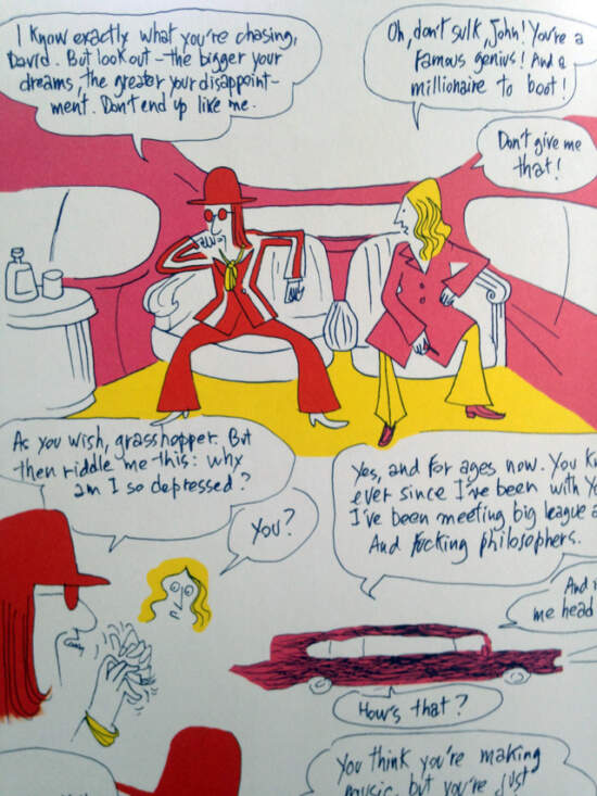 The story then mostly follows Mr Bowie’s doubts and dreams. It was clear to himself that he had talent, but how is he to execute upon it? Mr Bowie sees The Stooges live in concert and is captivated by Iggy Pop’s power vocals. He watches A Clockwork Orange and is mesmerised. There is no master tactician here with a thought-out plan to conquer the world through a combination of music and avant-garde culture. Instead there is a man who is open to influences, and yet cannot quite seem to get his act into gear. Over a beer in a local pub, he vents his frustration over the near-misses just like anyone else struggling with a career. Mr Bowie in this comic was never destined for global grandeur. He takes advice from successful musicians, like John Lennon. He is instead an Everyman, trying to work out where the rings of the ladder begin.