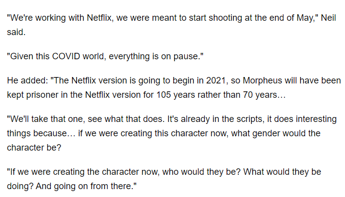 In July 2020, the website Digital Spy posted https://www.digitalspy.com/tv/ustv/a33359669/neil-gaiman-update-netflix-the-sandman/ this quote from Mr Gaiman: