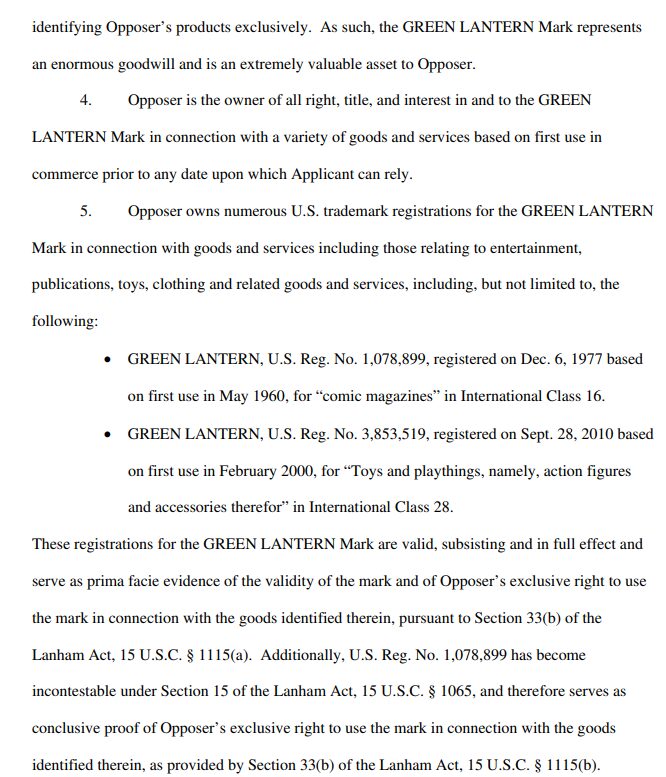 DC Comics has been involved in two disputes concerning Green Lantern trade marks before the United States Patent and Trade Mark Office, the first in 2012 and the second in 2016. How does DC Comics as a corporation define “Green Lantern”? The initiating document in the 2016 dispute captures it drily: