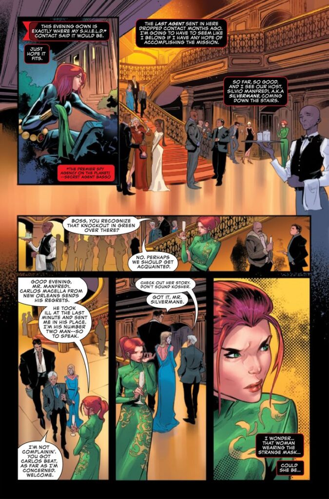 Black Widow is saved by a missing S.H.I.E.L.D. agent who has been outed, captured, tortured, and kept nearby by Silvermane. Why the agent did not try to escape but instead was compliant enough to wear a dress and a silver mask to keep her tortured features hidden is not clear. Never mind, says Black Widow at the conclusion, we’ll sort you out with plastic surgery.