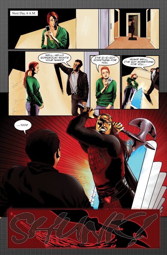 Jennifer is a very well-crafted character. She struggles with the idea of vengeance and is goaded into it by an appearance on television by Ricca, who boasts of planning his birthday. When a mobster is brutally decapitated, she is so frightened that she urinates herself. And when she dresses up to seduce a mobster, she is so scared she throws up in a toilet. This is not a typical action hero. It is instead an entirely believable character who is in over her head. On the first page of the title, Mr Hogberg explains the etymology to the comic’s title: ‘Tilt: A mental state in poker where emotion dictates your play instead of logic and reason.” Jennifer is suffering from tilt by not doing what any reasonable person would do – hide – but instead gambles without understanding the rules nor the value of the bet. Jennifer’s emotional make-up is extremely well portrayed.