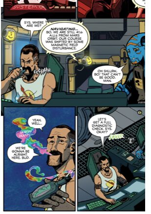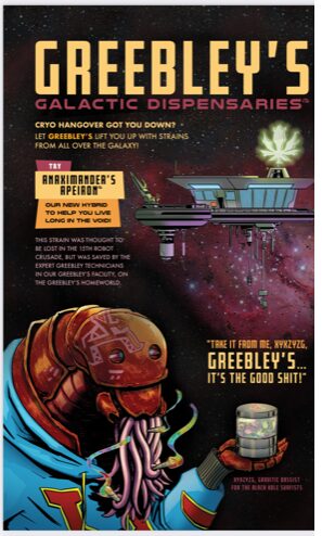 G’Lurk & Bo is clearly a different thing entirely. It is a parody, but one which, unlike Aliens: Dead Orbit, does not lean too heavily on the Alien plot template. The dialogue is very funny. After almost being sucked into deep space, G’Lruk says, “That was flurking scary, and I lost that joint! Flurk!” which made us laugh out loud – to die in the void is as much as a disaster as losing one’s recreational drugs to the void. The advertisements, one for the trustworthiness of the Sys AI platform, and one for “Greebley’s good shit”, are excellent intermissions to the slowly building tension, and remind us of Howard Chaykin’s silly, highly creative digressions in Amerikan Flagg! (First Comics, 1988). And there is a letters page, with some goofy faux-correspondence from readers including Mary Ellen from Virginia, who things G’Lurk is “really cute!”