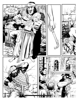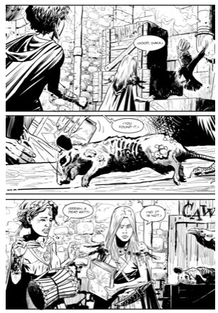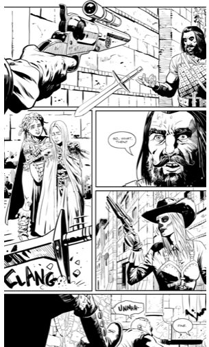 Much of the story of this first issue consists of a fight scene in a shabby cul-de-sac alley. It evolves that knives and clubs do not do so badly against sorcery. This interaction between the protagonists and some opportunistic thugs from a tavern not just acts as a hook to the reader through danger and action, but also underscores the emotional make-up of the two adventurers and demonstrates their magical powers.