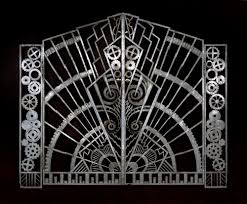 We rarely see Machine Age design in comics – an omission perhaps explained by the slow fading from memory of the 1930s. American comic books just post-dated the peak of that design ethic, and during World War 2 comics were filled with inexpensive art and cheaply manufactured for volume consumption. Alan Moore’s Tom Strong (America’s Best Comics, 1999-2006) had the concept, but not the style. Until AdventureMan, the most recent example of Moderne in an American comic book was J.H. Williams III’s dark and dangerous work in Greg Rucka’s wonderful Batwoman: Elegy back in 2009, in which the panels were replaced with lightning bolt bat wings. There is not much pearly hope to be seen in Batwoman: the red and black from the character’s costume, hair and lips contrasts with her dramatically white skin. But the dynamic panel positioning is reminiscent of Rene Chambellan’s 1928 wrought iron and bronze gates in the Chanin building in New York. By way of comparison, here are three examples, and then a picture of the gates: