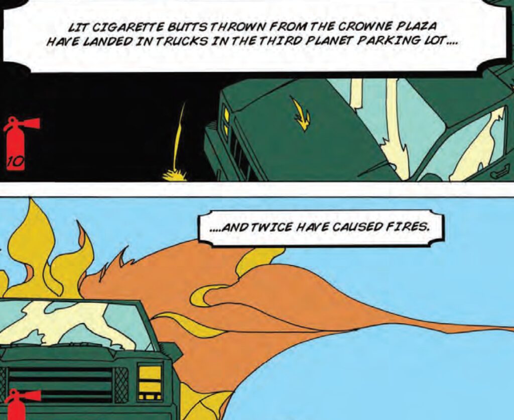 In this instance, however, the plaintiffs have written, drawn, and coloured a comic which details the history of the dispute, and incorporated that into the petition. This is the first time we have ever heard of this occurring in a formal court document. The lawyer who drafted the petition, Mr Cris Feldman, notes, “To aid in clarifying the facts of this case, plaintiffs provide the facts in illustrated form”. Each panel is denoted by a comic sans number contained within a fire extinguisher logo. We expect the numeration is necessary so as to indicate that each panel is the equivalent of a numbered paragraph in the petition, and that this is probably required by the District Court’s rules.