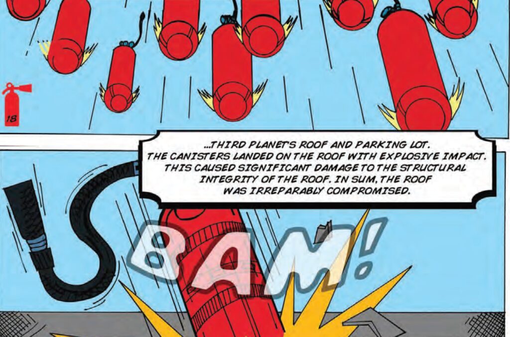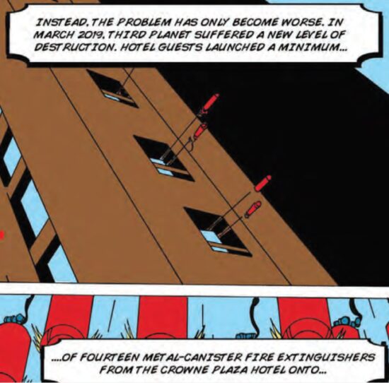 And what is our assessment of the comic? It might be short, but this comic is excellent. It is highly entertaining and it thoroughly makes its point. The fire extinguishers are depicted as akin to an artillery strike, and the visual dynamism especially of this section of the pleadings – um, panels of the comic – is a credit to the artists. We also liked how the comic appears within the petition with the section title of ‘Origin Story” and not a “Secret Origin Story”. Indeed, Mr Johnson made no secret of the problem, and is shown as determinedly marching into the defendants’ premises to complain about the repeated showers of dangerous debris falling onto the roof of his property, and then marching out from the same drab door, his face revealing his dissatisfaction and otherwise looking a little despondent. (We wonder whether Mr Johnson had a positive duty to complain, lest he become an accessory of some description under Texan law to the the hotel’s alleged negligence.) In a nice touch, Mr Johnson is otherwise twice depicted as stoically gazing over the city of Houston, as much of a landmark as his beloved store.