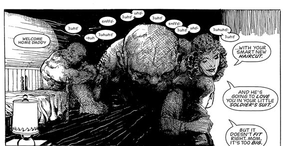The second half of the story is mostly composed of flashbacks, which introduce Bobby’s mother and father into the plot. It explores the horrors of war and their consequences on American family values, with most men coming back traumatized and hurting their families in turn. The story then changes protagonist again, as Bobby’s mother Janet takes over. Her story is how her husband became more and more paranoid since he returned from the war, as well as her struggles to protect young Bobby from an increasingly abusive parental figure.