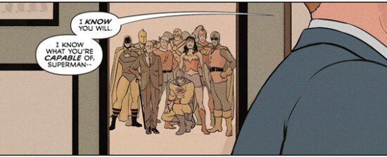 This book is also full of small references to other works. Easter eggs are usually self-indulgent or vapid. In this issue however they add to the subtext of the story and allow for interesting analyses of even the smallest detail. The Justice Society’s picture hanging from one of the walls of the White House is not just a reference to a similar picture in Watchmen. It is meant to attention to the juxtaposition: how differently those characters behave compared to the Minutemen of Watchmen, and how much less cynical and bleak Morrison depicts this world compared to the world of Watchmen. The logo on Superman’s chest is a reference to Kingdom Come, a book in which Superman similarly attempts to save the world proactively. This story is an echo of that title: an optimistic and hopeful reconstruction of superhero tropes, an artistic or thematic goal Morrison has publicly supported.