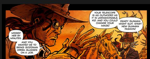 Outlandish art from Paul Mason underscores the bizarreness of the story. At one point, the Kid removes his sunglasses – perhaps “black glass spectacles” is a better description of the apparel given the era of the story – and thereby shares a mystic vision with Ten Shoes. Both the rendering of Ten Shoes’ face, jolted and numbed by the act, and the ghostly vision itself are striking. (We should also note the beautiful cover art by Australian artist Nicola Scott.)