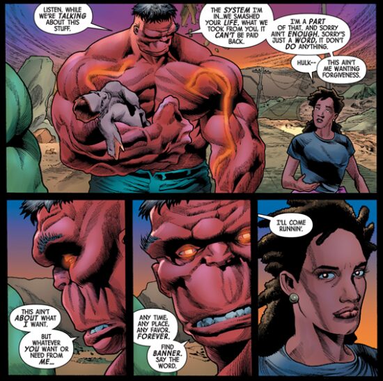 Joe is essentially applying this Aesop to the entire Hulk system: even if he himself is not responsible for what happened to McGowan, that doesn’t stop him from being kind to her and offering her whatever help she may need, promising that they’ll be there whenever she needs them.