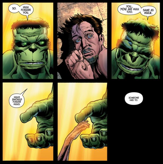 The only way to put an end to the cycle of violence and revenge, a cycle in which superheroes as a whole have been stuck in for years, the Hulk must do the one thing Robert Sterns could not do: forgive the ones who had wronged him.