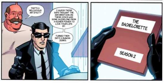 This first issue introduces Dirk and Jorge to the reader, as well as their profession: freelancers who procure relics and rarities for clients with enough money to afford their services. Reminiscent of the crew of the Millennium Falcon, our heroes are almost always broke due to mismanagement of funds and resources. They are hired to infiltrate a compound owned by a high ranking government official, and steal an ancient religious relic. This turns out to be a DVD collection of the TV show The Bachelorette‘s 2nd season. It’s a punchline that will most likely age poorly, but at the moment it is a humorous twist that hits its mark.