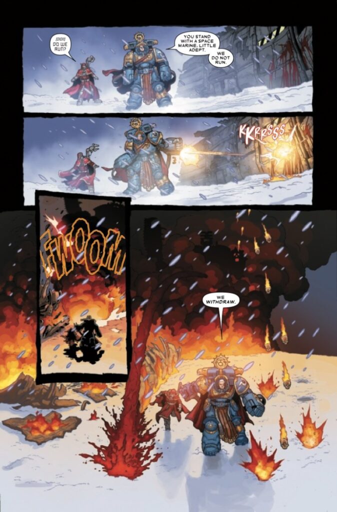 Jacen Burrows’ art, at the same time, works perfectly in the way it structures the story that is being told. The massive bulk of the Space Marines is obvious as other characters walk beside (or behind) them.