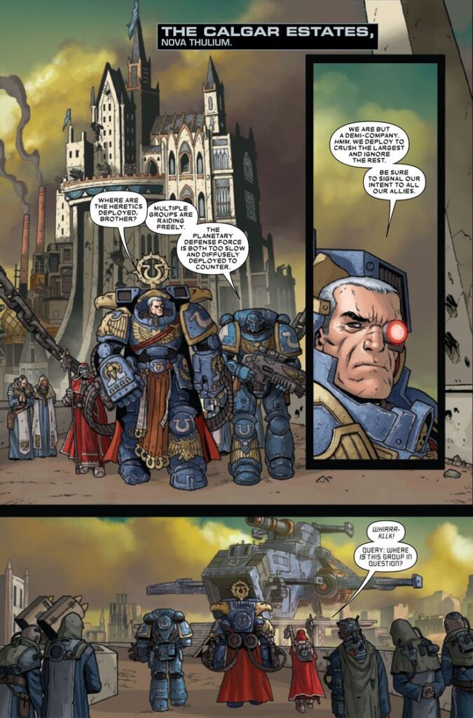 Marneus Calgar falls into the former, touching on the latter as the hope, coming from the publisher, to keep producing graphic novels based in the world (or, wouldn’t it be better to say cosmos?) of Warhammer 40k.