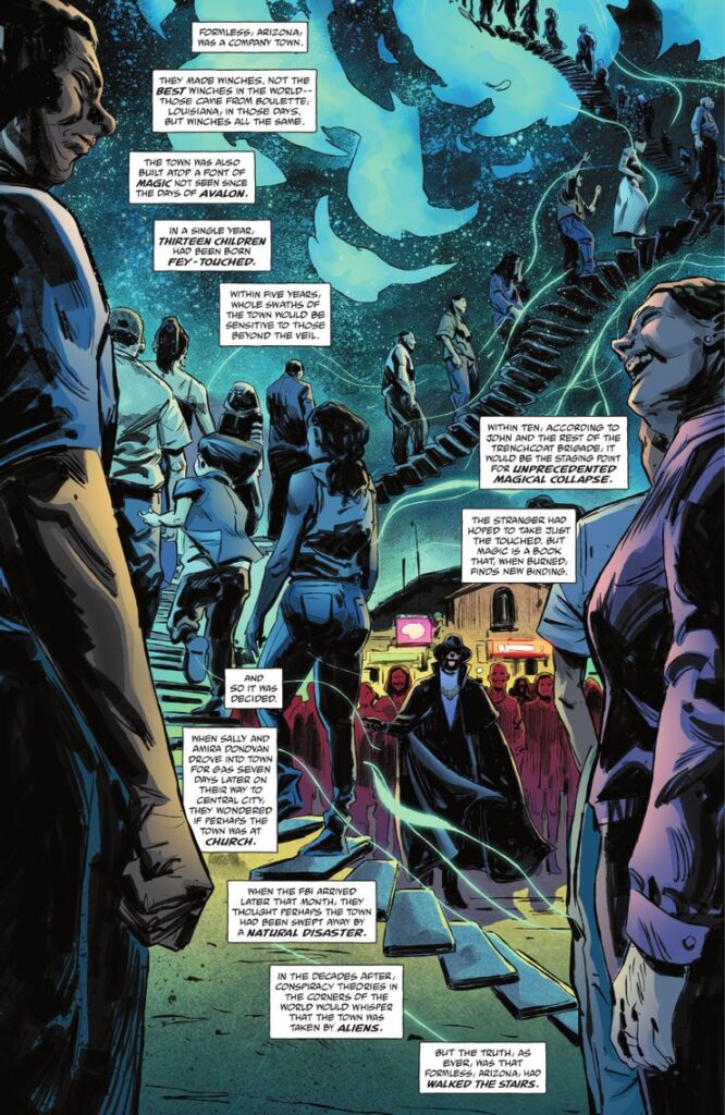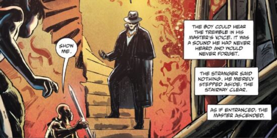 But more recently, in 2021’s Are You Afraid of Darkseid? #1 (a Halloween special), DC Comics postulated that the Phantom Stranger was some sort of Chief Editor. The story is called The Endless Staircase, by Collin Kelly, Jackson Lanzing, Jesus Hervas, Eva De La Cruz and Clem Robins. People who knowingly or unknowingly represent threats to existence, or who might upset the precarious balancing forces of magic, are ushered by the Phantom Stranger up a figurative staircase into oblivion. Below, we see the Phantom Stranger taking a blacksmith who has made a sword of Nth metal (a substance most frequently associated with the Golden Age version of the superhero Hawkman):