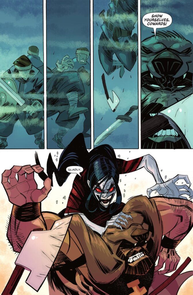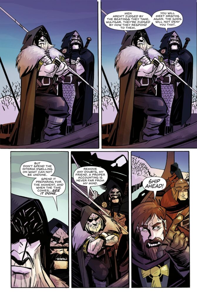 River of Blood, a complete story by writer Sean Fahey and artist Carlos Trigo, is part and parcel of this pulp heritage, moving deftly between evil presences and dismemberment. A band of mercenaries, coming from the North (that is, North Europe) escape from Byzantium to find themselves on a quest to free a village from the curse of vampiric monsters.
