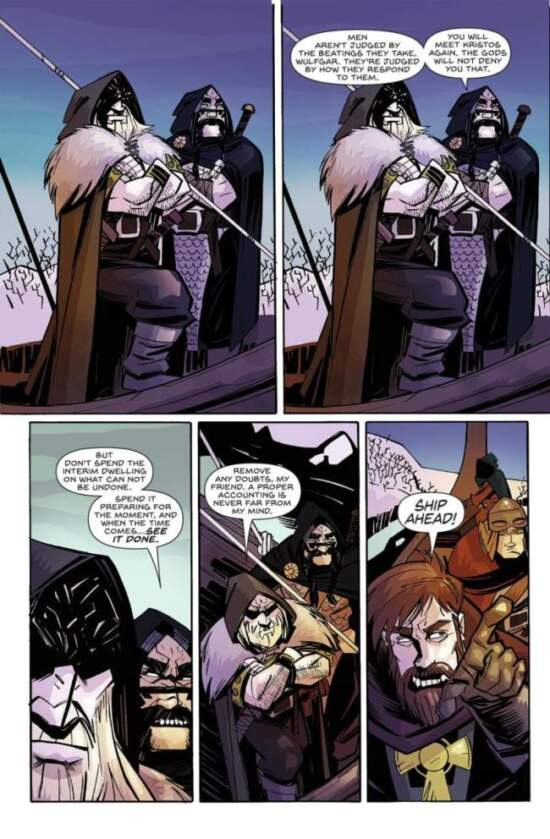 Reading this book to find an essay on the inner mechanisms of the human creature, anyway, would be quite misleading. The main goal of the adventure being told here is that of entertainment, and from this point of view the book manages to fulfil our expectations. As a tribute to the pulp magazines of the ‘20s and ‘30s, just as of many a B-movie, the comic unfolds in such a way that reading it becomes a pleasure on different levels. There is little denying, for instance, that the world building, with its medieval setting, mixes real life and imagination, so that we can recognize what is (or rather, was) part of our world. Yet it is rewritten and reshaped in such a deft way that it manages to serve its purpose without diminishing its overall effect. In other words, if there is a dialogue between reality and fiction, Messrs Fahey and Trigo contextualize it as part of the history of the pulp subgenre.