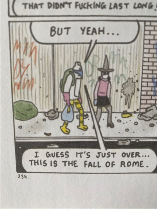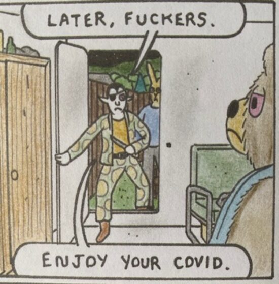This is not the first pandemic-inspired comic we have reviewed. It is tempting to try and intellectualise the story. Is this just an expression of the bleak uncertainty and panic which manifested with the Covid-19 pandemic started spreading? The characters in this story do not just hoard toilet paper and buy supermarket trolleys of pasta: they devolve into violent and immoral anarchy.