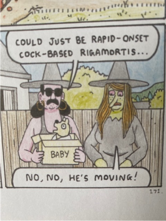 Which makes what Australian creator Simon Hanselmann has done all the more amusing. Crisis Zone is the latest in a run of parodies featuring “Megg” and “Mogg” and Owl. In this vision, Mogg (a complete dick, to use the vernacular) and Meg (an anxiety-ridden hopeless case) are romantically involved. Owl is the only person with half an idea. None of the cast are stable individuals, to say the least. The series started as a webcomic on Mr Hanselmann’s Instagram, and has now been published as a completed work.