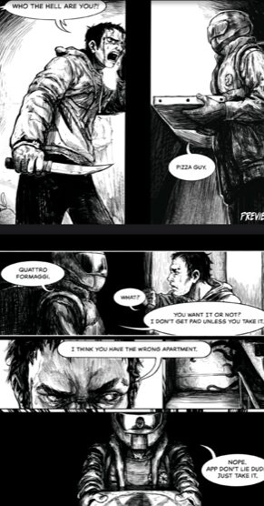Some of the lines are startlingly cynical. “Wait… am I dead? Typical,” says Burger at one point. That cynicism descends into deep black humour, reserved for the observant reader: the pizza deliver guy wears a motorcycle helmet that renders him faceless to Burger during the accidental delivery. We expect something disgusting to manifest out the pizza, given burger’s appetites, and we are blindsided by the sudden, horrible events that follow.