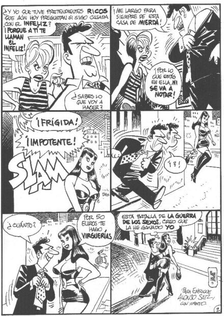 The aim of Clara de noche is to present a sex worker under such a light as to make her job be accepted not because of some theoretical inner value, but rather because the person performing this job, the eponymous Clara, does not disowns her role at all. She is, first and foremost, a puta who is also a mother, and in both cases she is one of the best examples of both categories. The end result of all this is that we come to accept her as a person, and a caricature of course. She is not as the butt of our jokes (yes, in case you’re wondering, the pun is intended), but rather as the catalyst to many a short adventure which see, nearly all of them, her carrying out her duties with her customers. Sex is the game, and it is well possible that the series of episodes, to be read once we are mature enough, can be too cartoonishly graphical for some eyes.