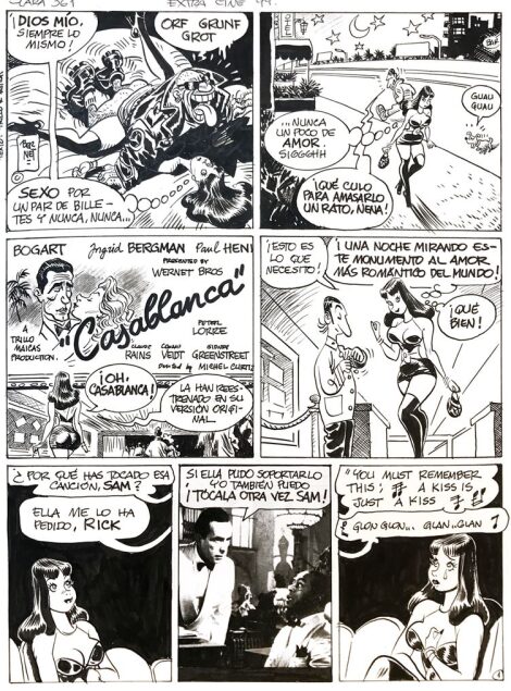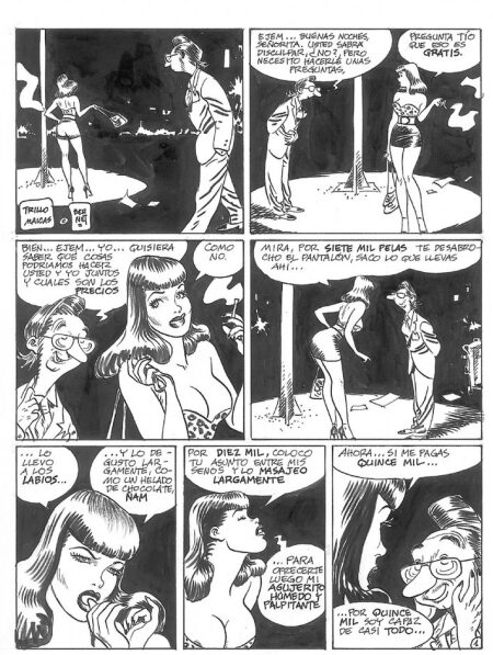 A satirical series of adventures, each one consisting of two pages, Clara de noche is therefore a representation not just of Spain’s caustic sense of humor (a sense of humor not everybody shares in that European peninsula), but also a means to test our own. Having started with a bit of a melancholic attitude, Messrs Trillo and Maicas seem to accept a most carefree point of view after a few panels, a change represented by Jordi Bernet’s style moving away from realism and embracing a lighter sentiment of cartoonish liberty. Some might be offended, for sure. It would not be anything the authors had not thought of when conceiving Clara and her adventures. Let people be free, so seems to be the main idea, free to pay for sex as much as to be paid for if, let us be clear once again, no one is being forced to do so. And, by so doing, let us never forget “castigat mores ridendo”; humans, after all, can be so ridiculous.