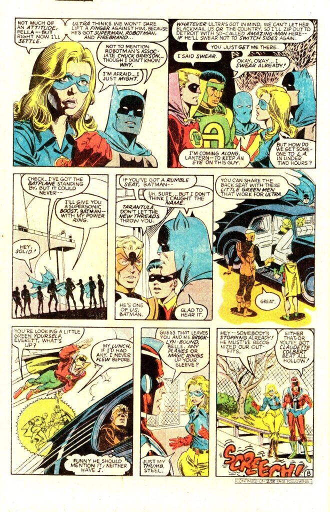 This colorful heroine in jodhpurs had debuted in Boy Commandos #1 (Winter 1943), on sale in autumn of 1942. That’s nearly a year after the time period in which All-Star Squadron would be set, but I had a way around it: