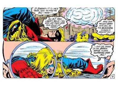 It was not until comics writer and later period historian Roy Thomas blew the dust off his archived issues and revived the character for his title, All-Star Squadron (1981-1987) that the character came into genuine prominence. Liberty Belle would lead the likes of Batman, Superman, the membership of the Justice Society of America, and many other superheroes during the grimmest days of the war. Chauvinistically even for 1940s, Wonder Woman was merely the secretary of the Justice Society of America: Liberty Belle as at 1981 was the chairwomen of the much larger All-Star Squadron, and was depicted as having the ear of wartime president Franklin D. Roosevelt.