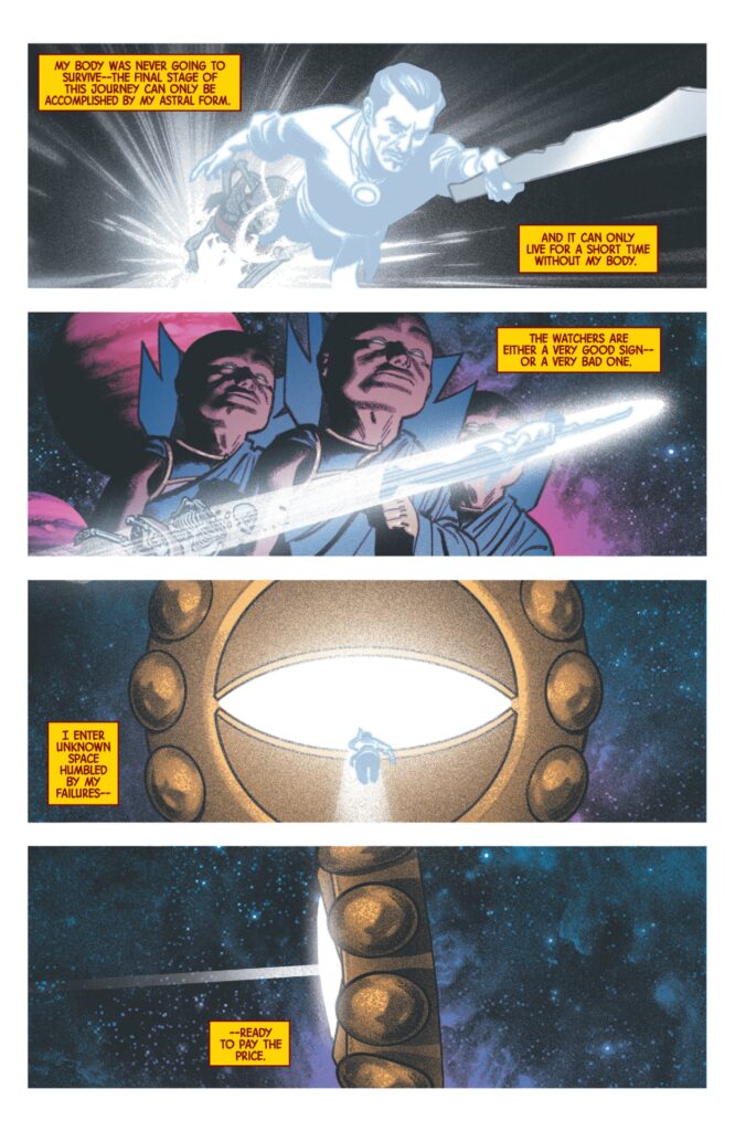 Strange is reduced to nothing but a living skeleton hanging on to dear life as the shard of the Surfer streams through both time and space. The Watchers see Strange fly by. Strange, somehow, enters a giant Eye in space and speeds through the intersections of the multiverse (a retro filled two page splash of vivid colors) and eventually lands dead in a wasteland cabin. His death is a warning to his friends that Dormammu will take over the future. But now they know and can stop it from happening.