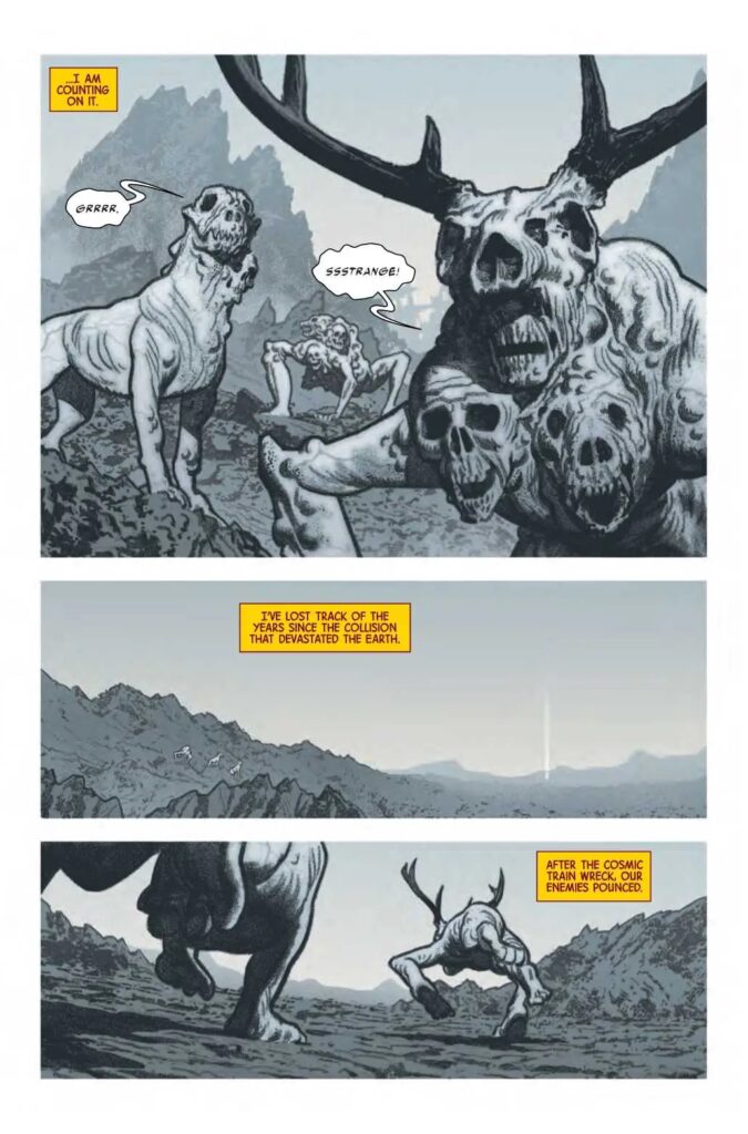 Feeling the end of all things are near, we get the feeling that when he removes one of his eyeballs it might be his first heroic act in ages. Heroic because this is the price he pays to use magic. Magic does not come easy or unpunished in these last days. Strange places the eyeball into the golden medallion. The eye of Agamotto lights up and leads him. He knows that, his enemy, Dormammu’s henchmen (skull infused demon dogs?) will feel the magic of the newly opened eye and come for him. Dormammu now rules the world. Strange ties a rag around his head, covering his empty eye socket and walks farther into a barren landscape.