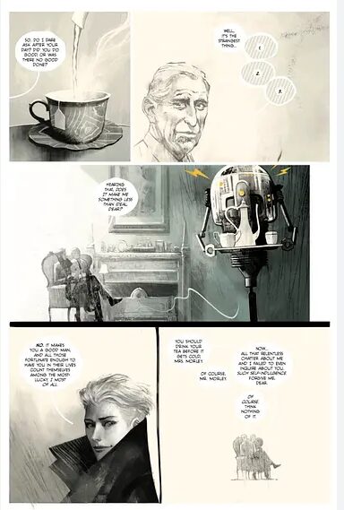 The hero of this story, Neha, wants to free her family from a hermetic suspension. They will be cured of a pandemic illness and released when finally aggregates enough cash. And she has a long way to go.Contrasted with this base existence is the stylish master assassin, Imogen. She cannot possibly be British – who knows where the Earth is in this universe? – but she clearly has modern British élan. She even drinks tea, with a husband who looks remarkably like King Charles: