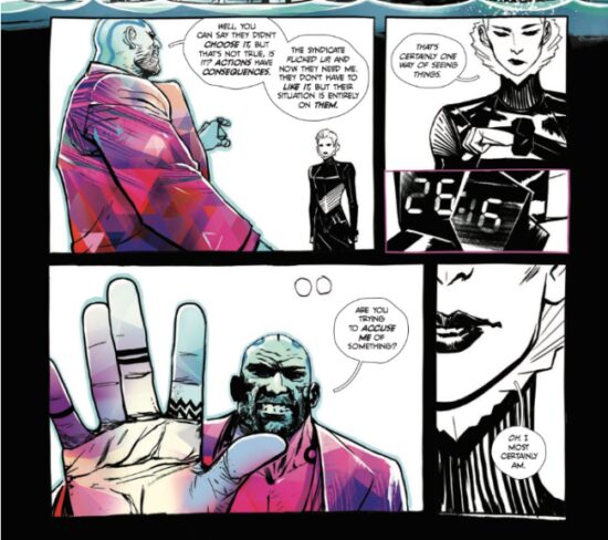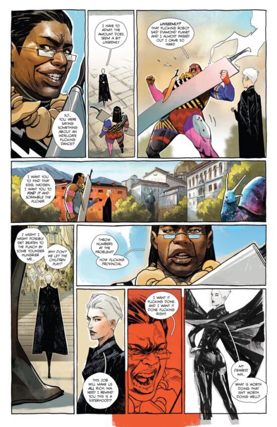 Set in the far future, Decorum describes a series of human and alien civilisations scattered across our galaxy, traversed with the sort of almost casual interstellar flitting we see in the Star Wars motion pictures. There are governments and grand diplomacy between federations of worlds, to be sure, but people still toil away, trading and hustling and getting on with life. When The Comics Journal says https://www.tcj.com/reviews/decorum/, “ Decorum is all over the place. Only Hickman’s skill as a writer saves the book from being completely self-indulgent, and while the story is absolutely brimming with ideas, there are so many of them that even over the course of 400+ pages, none of them stick around long enough to truly immerse the reader“, we completely disagree. Society is complex, and will remain so. Mr Hickman brings that home.