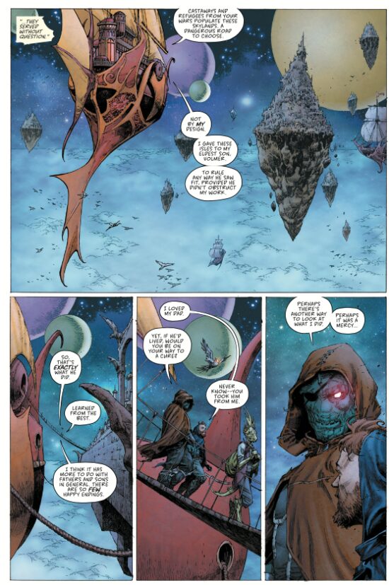 “Remender lists famed series like “Dune” and “Lord of the Rings” as direct inspiration for this mashup of sci-fi and fantasy and it shows. There are starships, dynasties, and men destined for the throne while villains sit upon it. With its Western themes, castles, futuristic technology, and bizarre creatures in these ‘blasted lands,’ I can’t help but be directly reminded of Stephen King’s magnum opus, “The Dark Tower.” While he has never been quoted in saying that this book exists because of that series, I can’t imagine it would without it.”