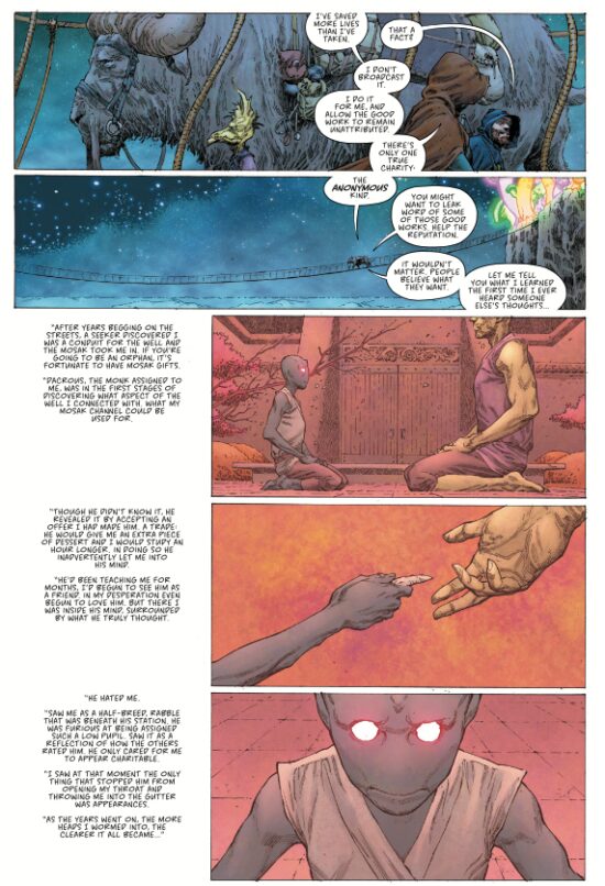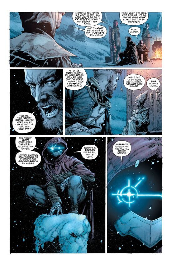 Osidis initially presents as a courageous father who survives against formidable odds, but at the end of the day, he is corruptible. “Family and responsibility and sacrifice” together is a mask to his deep flaws. Osidis presents as almost pious: Mr Opena draws Osidis with hair shorn around the ears, but long on the top and with a full beard: it is not cut through vanity but as an expression of fidelity. Osidis wears his family sigil on his chest, a white dragon, of sorts, on a black background. It has an unhappy history as an emblem of betrayal in the eyes of the remaining Mosak. The stain of his family name never leaves him. As the story progresses, and he engages in betrayal and selfishness, we come to question him in small degrees. Faced with the ability to heal himself from a deadly lung disease, he meets a creature which literally lives in another’s dead and is capable of divining truth from lies. Osidis is faced with a truth: that his motivation in saving the antagonist of the series – the Mud King – is not to save his family, and that he has lied to himself for years.