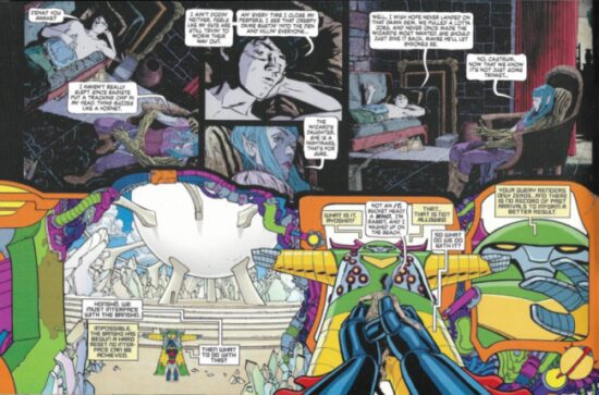 Part of the problem we think is the absence of good editing. There is a piece of dialogue which stands right out – an alien fortune teller begins two consecutive word balloons with the word “But”, suggesting that at least one of these was inserted later without regard for the continuity of the speech. Strategic editorial intervention might have stopped the gangster character being inexplicably enhanced with a violent Kirby-esque energy core: did the creators find the character otherwise limiting after four chapters? And why were two significant subplots in the story confusingly delivered to the reader in two levels – an upstairs and a downstairs – over consecutive pages when they would have been far easier to follow with separate chapters? An innovating way of telling a story is not an effective innovation when executed as a confusing mess.