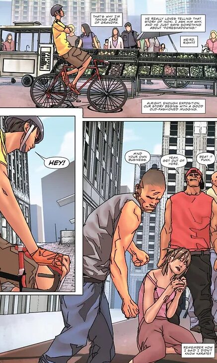 Mr Nguyen is handy with a pencil, too (he is an experienced artist, having worked on titles for American publisher Marvel Comics). Mr Nyugen manages to shift the reader from urban America, with its buildings, cars and fastfood joints, to medieval Japan, with its temples, carts of straw, and samurai melees, all without missing a beat. The action sequences are dynamic and busy without being cluttered. The art is very, and appropriately, reminiscent of samurai epic Lone Wolf and Cub (Futabasha / First Comics / Dark Horse Comics, 1970-1976).